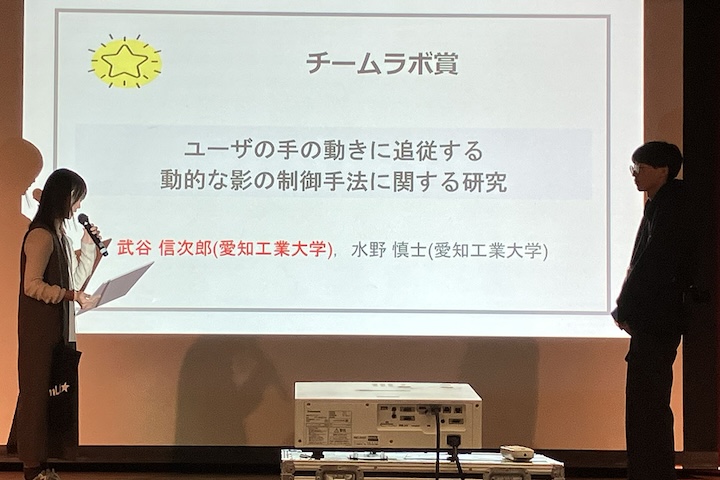 H. Iwasaki, M. Kondo, R. Ito, S. Sugiura, Y. Oba, S. Mizuno, "Interaction with Virtual Shadow through Real Shadow using Two Projectors", SIGGRAPH 2016 Posters (Anaheim, USA, 2016.7).