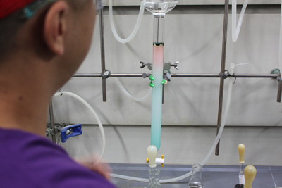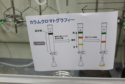 M2の仮屋薗くんによるカラムクロマトグラフィーの実演。 |