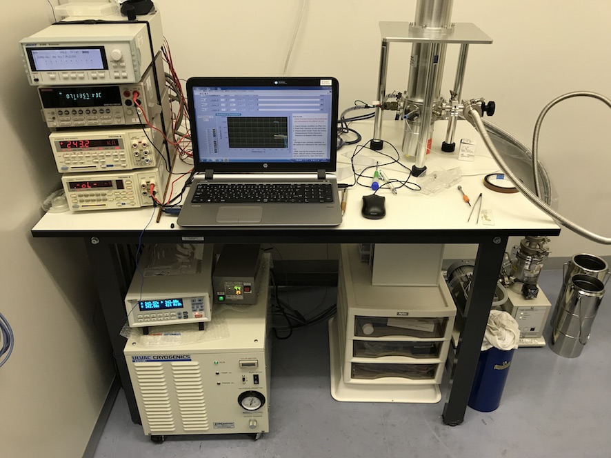 電気伝導度測定系(左上+PC)と接続しており、単結晶試料を用いた温度可変電気伝導度測定に用います。20 Kから360 Kまでの温度コントロールが可能で、4サンプルを同時に測定できる仕様になっています。測定プログラムは、京都大学 矢持研究室で作製・使用しているプログラムを使わせていただいています。