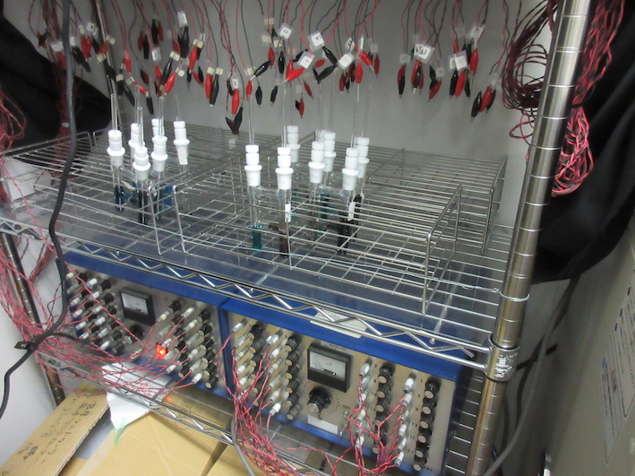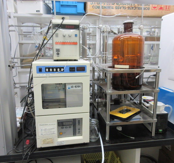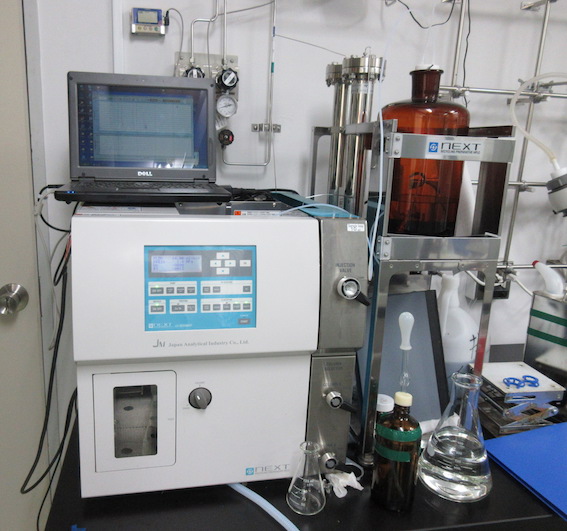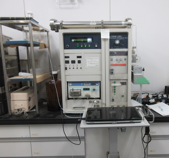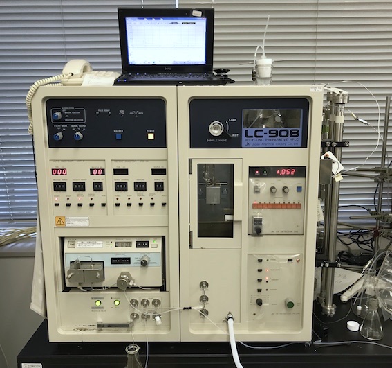 当研究室では最も初期型で、2010年1月にオーバーホールを行いました。クロロホルムやメタノールなど、各種溶媒が使えるカラムを揃えています。最近ではキラルカラムでの光学分割も行っています。 強力ポンプを備えたタイプで、JAIGEL-1H(φ40 mm, クロロホルム)のゲルろ過カラムを設置しています。1.5 gまで分離できる優れもので、大量合成・大量精製ができます。 |