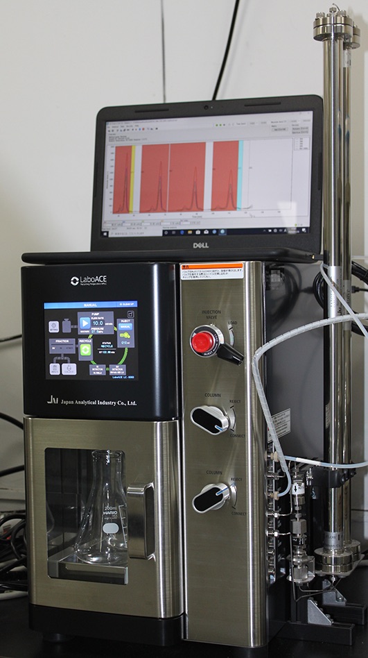 HPLCにTHF対応のカラムを設置したものです。より高極性・難溶性のサンプルの分取も可能です。 小さなボディですが、分取のためのすべての機能が備わっています。シートスイッチ上で全ての操作が可能です。前面のつまみで溶媒・カラムの変更が容易にできます。 |