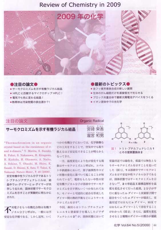 化学同人「月刊化学(2009年5月号)」にて、窒素導入型フェナレニル中性ラジカル誘導体に関する我々の論文(Nature Materials 2008, 7, 48-51)が、広島大学の宮碕 栄吾 先生、瀧宮 和男 先生に「注目の論文」として取り上げていただきました。(2009.4.16)