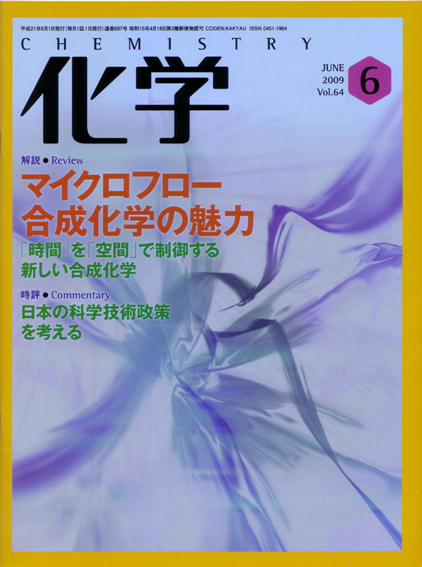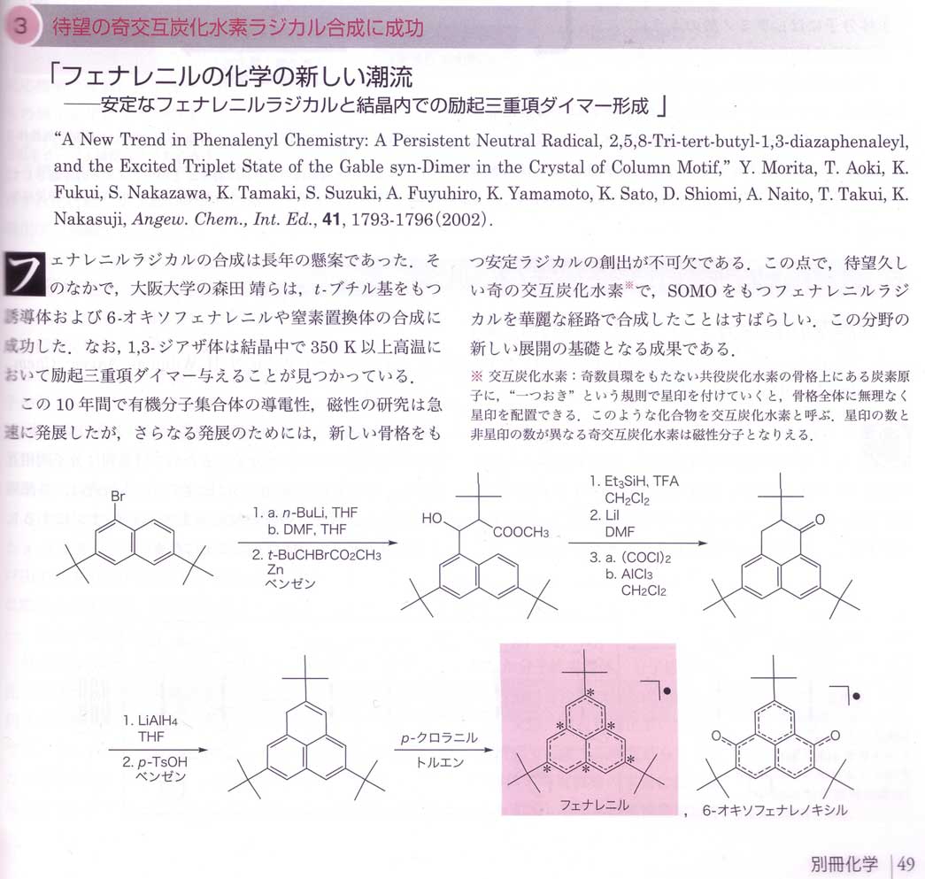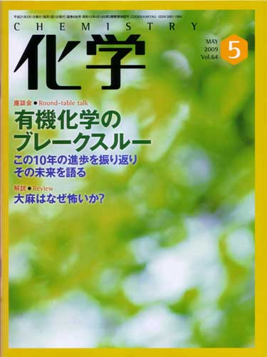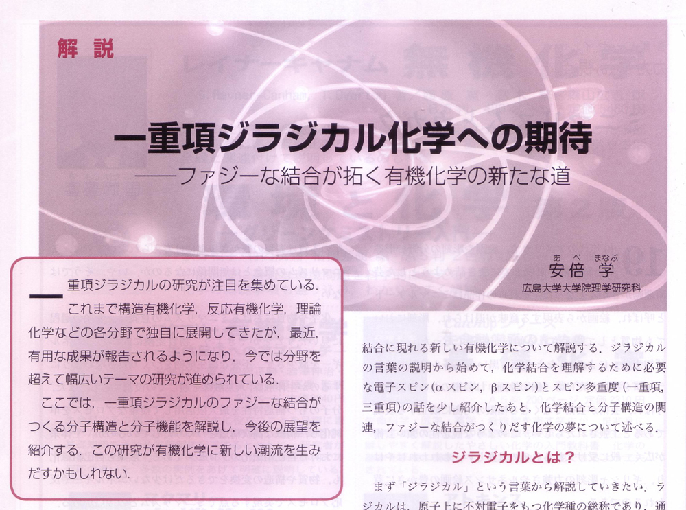 化学同人「月刊化学(2009年6月号)」に掲載されている安倍 学 先生(広島大学)による「一重項ジラジカル化学への期待」において、「ラジカルπダイマーの一重項ジラジカル性」という観点で窒素導入型フェナレニル中性ラジカルについての我々の研究成果を取り上げていただきました(2009.5.23)