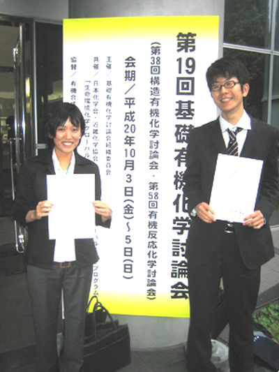 第19回基礎有機化学討論会(2008年10月3-5日、大阪大学)において、山本陽介(M2)と山中あずさ(M2)がポスター賞を受賞しました。