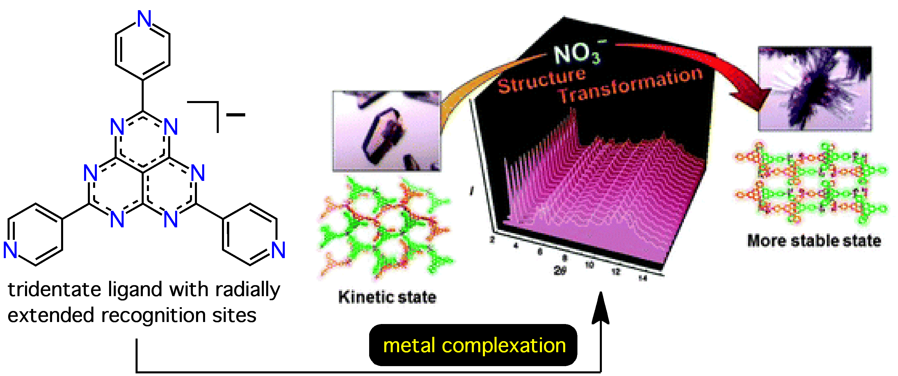 三つのピリジン環を有するヘキサアザフェナレンを市販品から一段階で合成することに成功しました。対応するアニオン体は3回対称性を有する新規な配位子であり、各種の金属イオンと反応し錯体を形成します。本論文では、動力学的錯体から熱力学的錯体への動的変換に関する実験結果も合わせて報告しています。Chem. Commun. 誌にアクセプトされ、web 上に公開されました。
