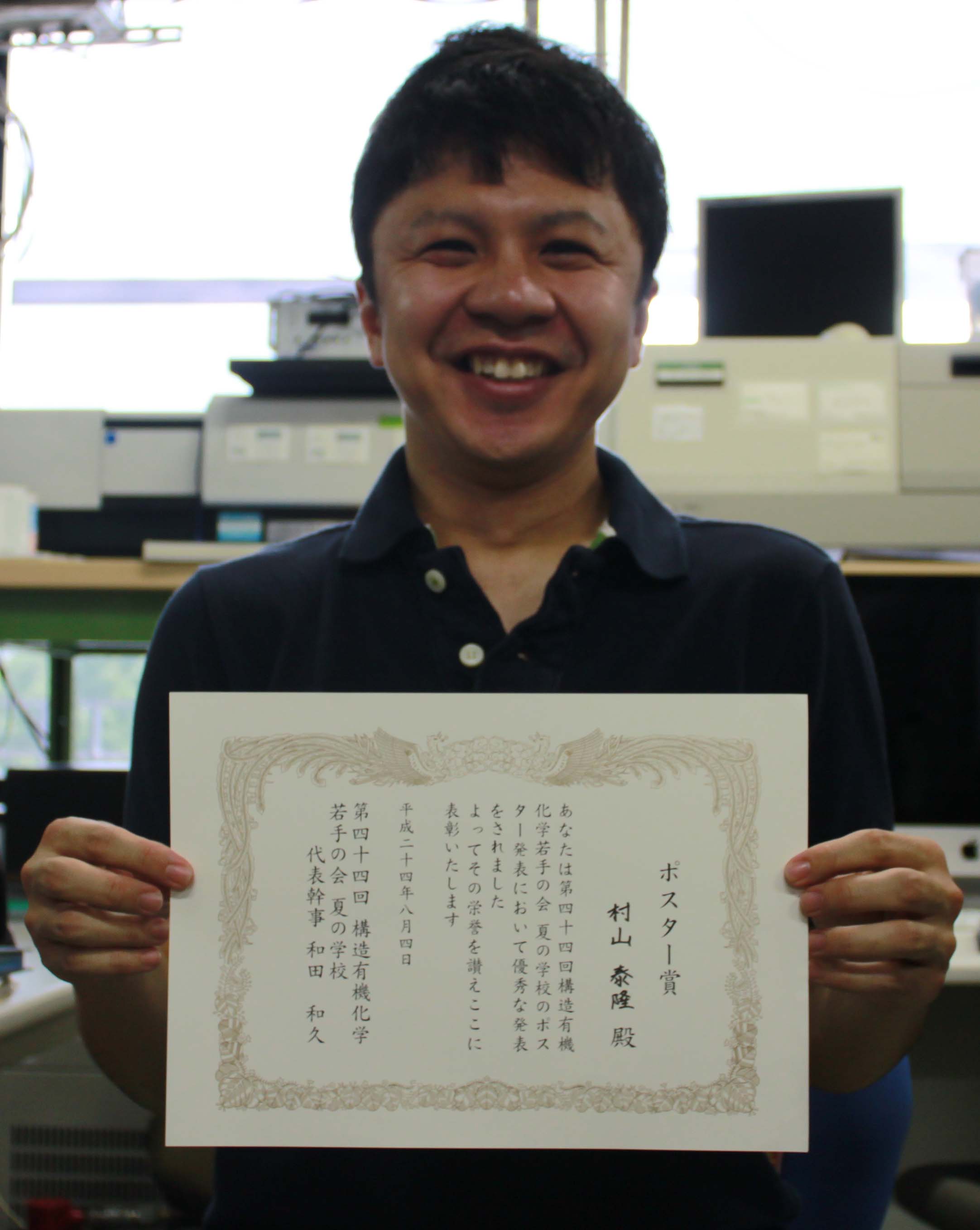 第44回構造有機化学若手の会 夏の学校 (2012年8月2〜4日、定山渓万世閣 ホテル ミリオーネ) において、村山 泰隆 君 (修士課程2年) がポスター賞を受賞しました。