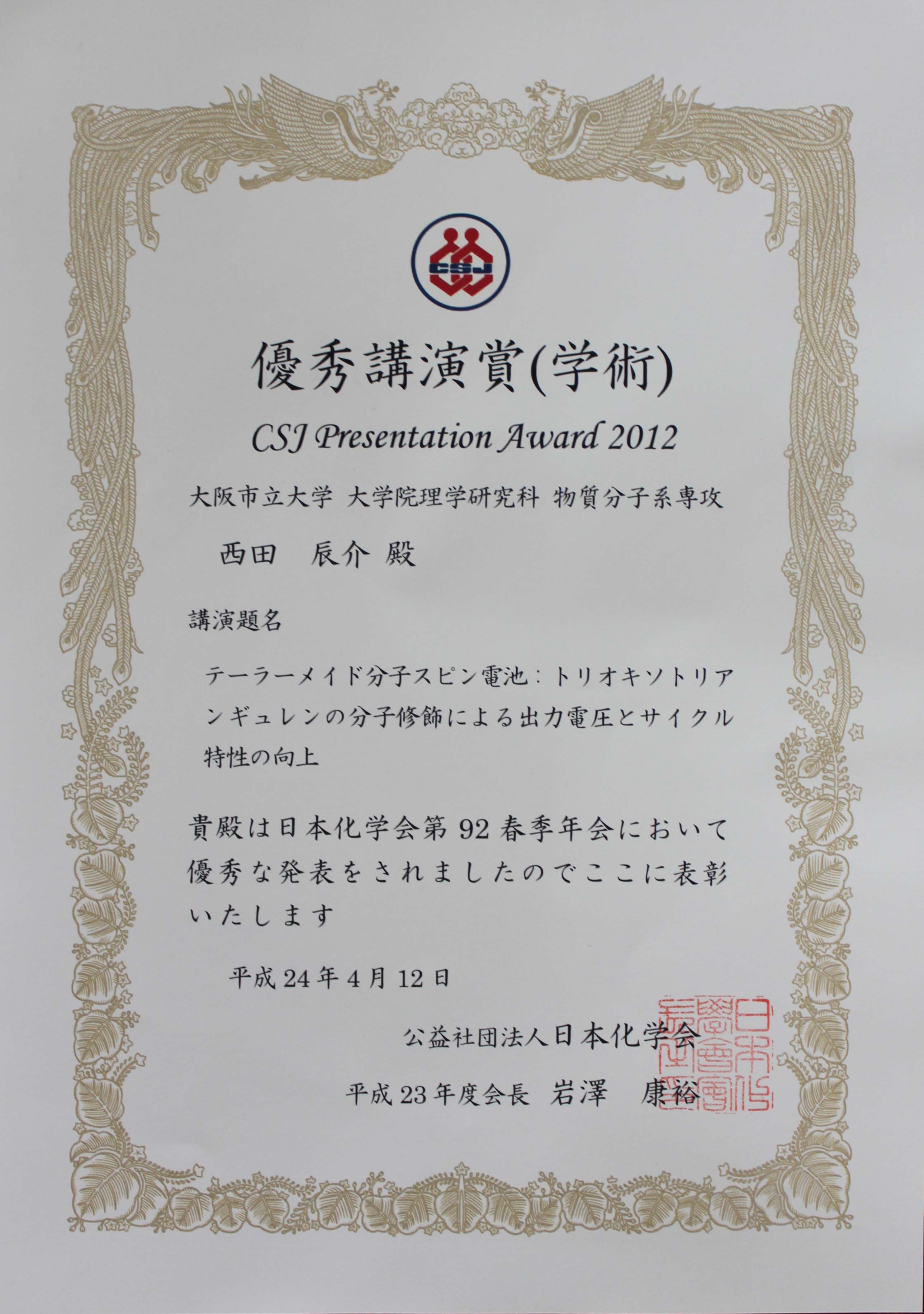 西田辰介 博士(平成17年3月に当研究室で学位取得、現 大阪市立大学理学研究科博士研究員)が日本化学会第92春季年会において、「優秀講演賞(学術)」