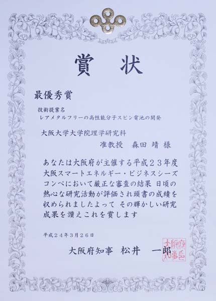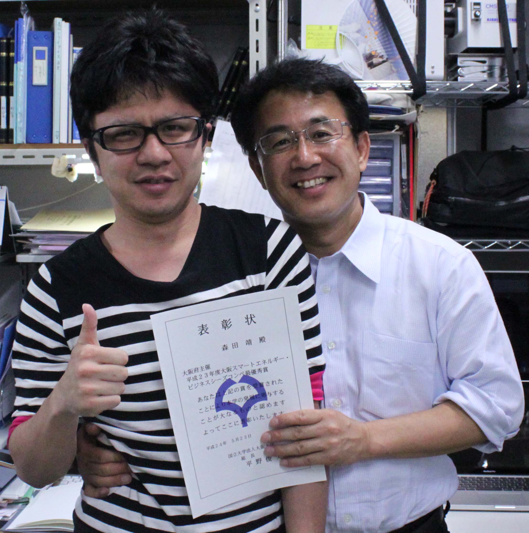 森田先生が、「大阪府主催平成23年度大阪スマートエネルギー・ビジネスシーズコンペ最優秀賞」