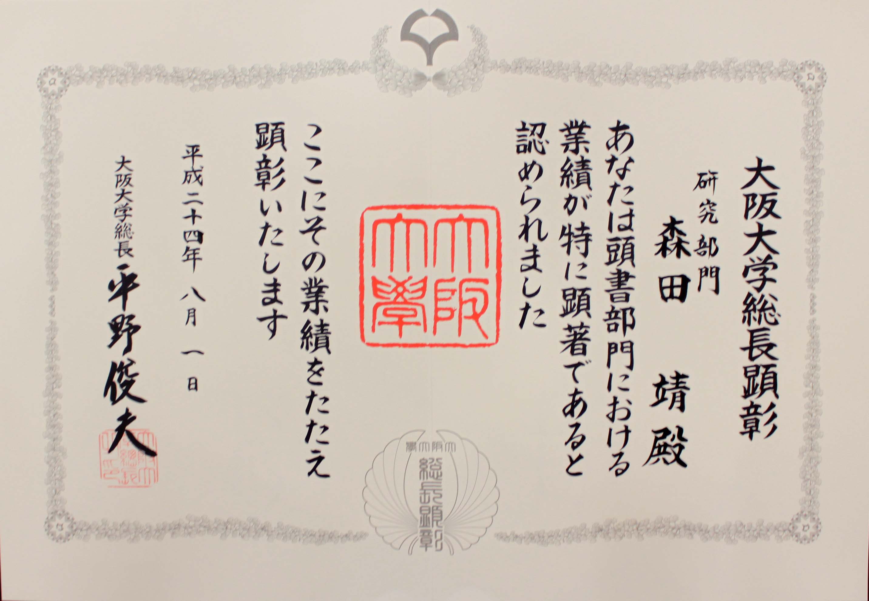 森田先生が、「平成24年度 大阪大学総長顕彰(研究部門)(Osaka University Presidential Awards for Achievement in Research)」を受賞しました。