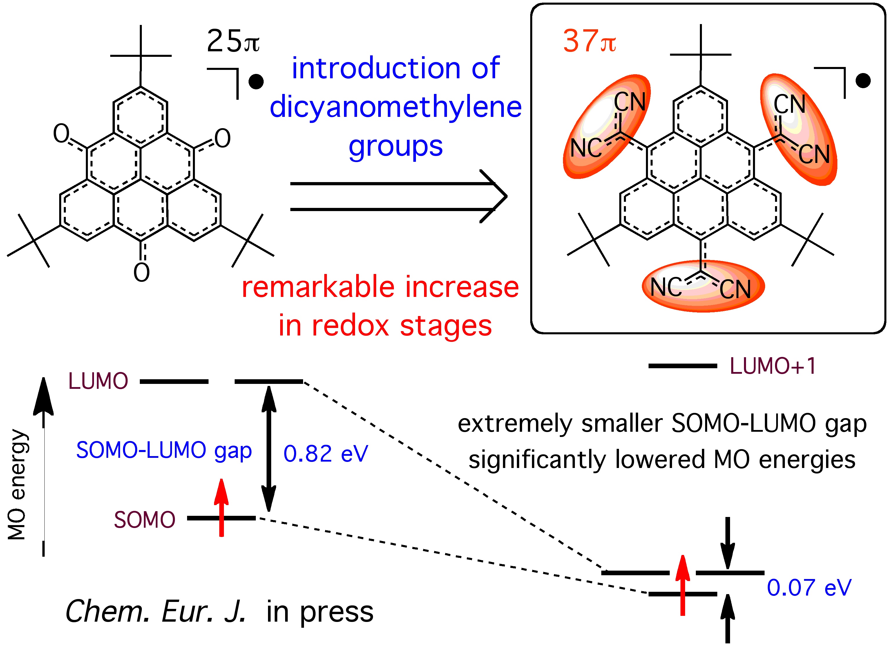トリアンギュレン骨格にジシアノメチレン基を導入した三回対称型新規中性ラジカルの TOT を超える多段階の酸化還元挙動に関する論文が、