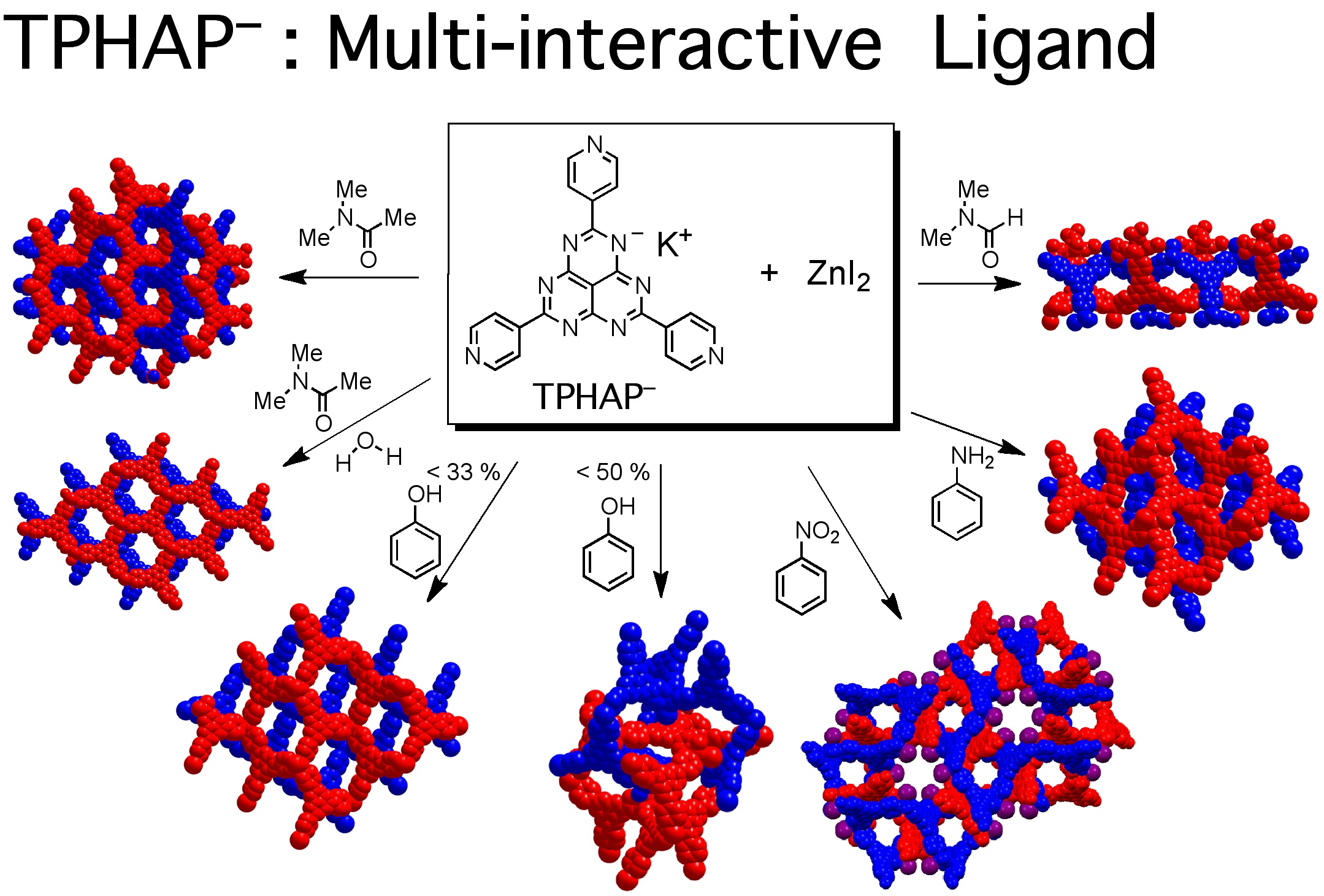 多点相互作用部位を有する配位子TPHAP− とヨウ化亜鉛の自己集合によって溶媒の種類に応じ7種類もの配位性ネットワーク錯体が得られた。それぞれのネットワークは異なる相互作用様式を有する細孔を形成した。溶媒の違いによってもたらされたネットワークの多様性は弱い分子間相互作用のわずかな違いを認識するTPHAP− の多点相互作用能の効果を明確に示している。