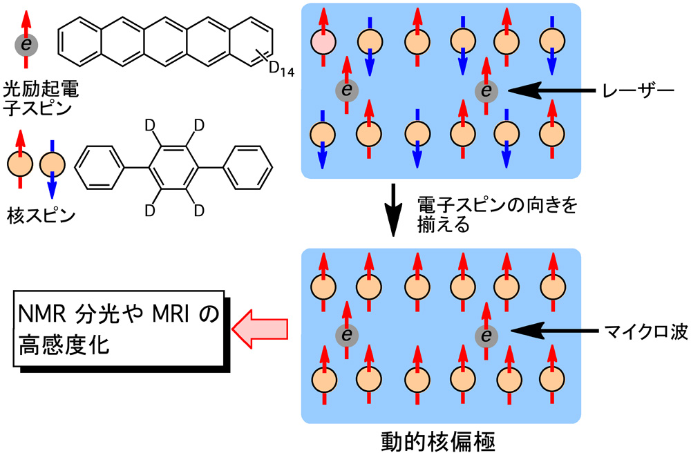 大阪大学基礎工学研究科の北川勝浩教授の研究グループと我々の共同研究により得られた研究成果が米国科学アカデミー紀要 (Proc. Natl. Acad. Sci. U.S.A.) に本日掲載されました。我々が合成した位置選択的に重水素原子を導入したp-ターフェニル誘導体にペンタセンをドープした単結晶を用いた、レーザー光とマイクロ波による「光励起三重項状態の電子スピンを用いた動的核偏極法 (Triplet-Dynamic Nuclear Polarization)」についての研究結果であり、室温でのNMR信号を1万倍以上増大させることに世界で初めて成功しました。本研究成果は、極低温装置を使用せず低コストで、低温で分解してしまう生体物質や化学物質測定の高感度化を可能にし、化学分析に用いられるNMR分光や医療に用いられるMRI(核磁気共鳴画像)の飛躍的な高感度化に道を拓く画期的な研究成果です。