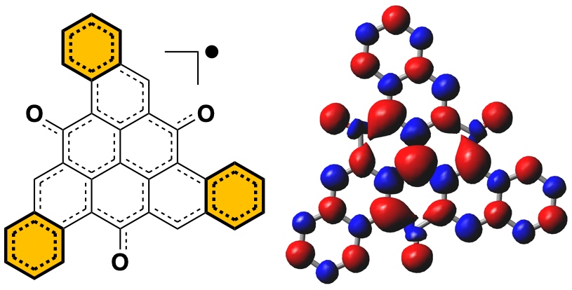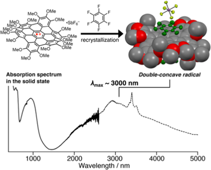 大阪大学大学院基礎工学研究科の鈴木先生らとの共同研究の成果が、WILEY-VCH社の国際的科学雑誌であるChemistryEuropeに掲載されました。巨大なπ共役系をもつヘキサベンゾコロネン誘導体のラジカルカチオン塩がその褶曲分子構造によりゲスト分子を包摂した錯体を形成することを明らかにしました。また、その近赤外光吸収や磁気物性などの電子物性がゲスト分子の有無により変化することを明らかにしました。