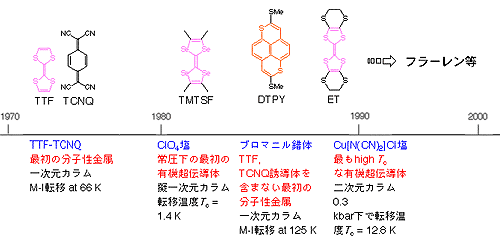 下に分子性導体の例を示した。TTF-TCNQ錯体は1973年に合成された最初の分子性金属である。[1,2] このTTF-TCNQ錯体は66 K以下の温度では絶縁体へと転移することが知られている。この絶縁体への転移を防ぐためTMTSFやETが合成され、これらのラジカル塩においては超伝導状態までも実現された。[3,4] 一方、当研究室で開発されたDTPYはブロマニルやクロラニルと電荷移動錯体を形成し、これらはフルバレン骨格 (図のピンク) とTCNQ骨格を含まない初めての分子性金属を形成した。[5]
