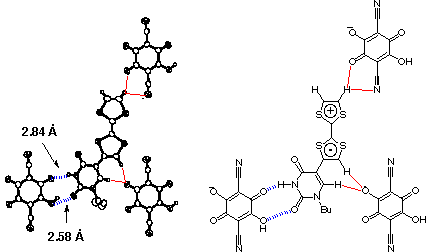 TTF-ウラシル (チミン) 誘導体は非常に良好な電子ドナー性を示す。これらの化合物はTCNQ等の各種アクセプター分子と電荷移動錯体を形成した。その中でもシアナニル酸との電荷移動錯体 (下図) について結晶構造が明らかとなった。ウラシル部位はシアナニル酸と相補的な二重水結合 (青の点線) を形成していた。またC-H矣畊水素結合 (赤の実線) によりさらに結晶が安定化されており、相補的二重水素結合とC-H矣畊水素結合からなる二次元シート構造を形成していた。しかし温度可変分光測定においてプロトン移動の有無は確認されておらず、今後圧力依存測定の必要性があると考えられる。[7]