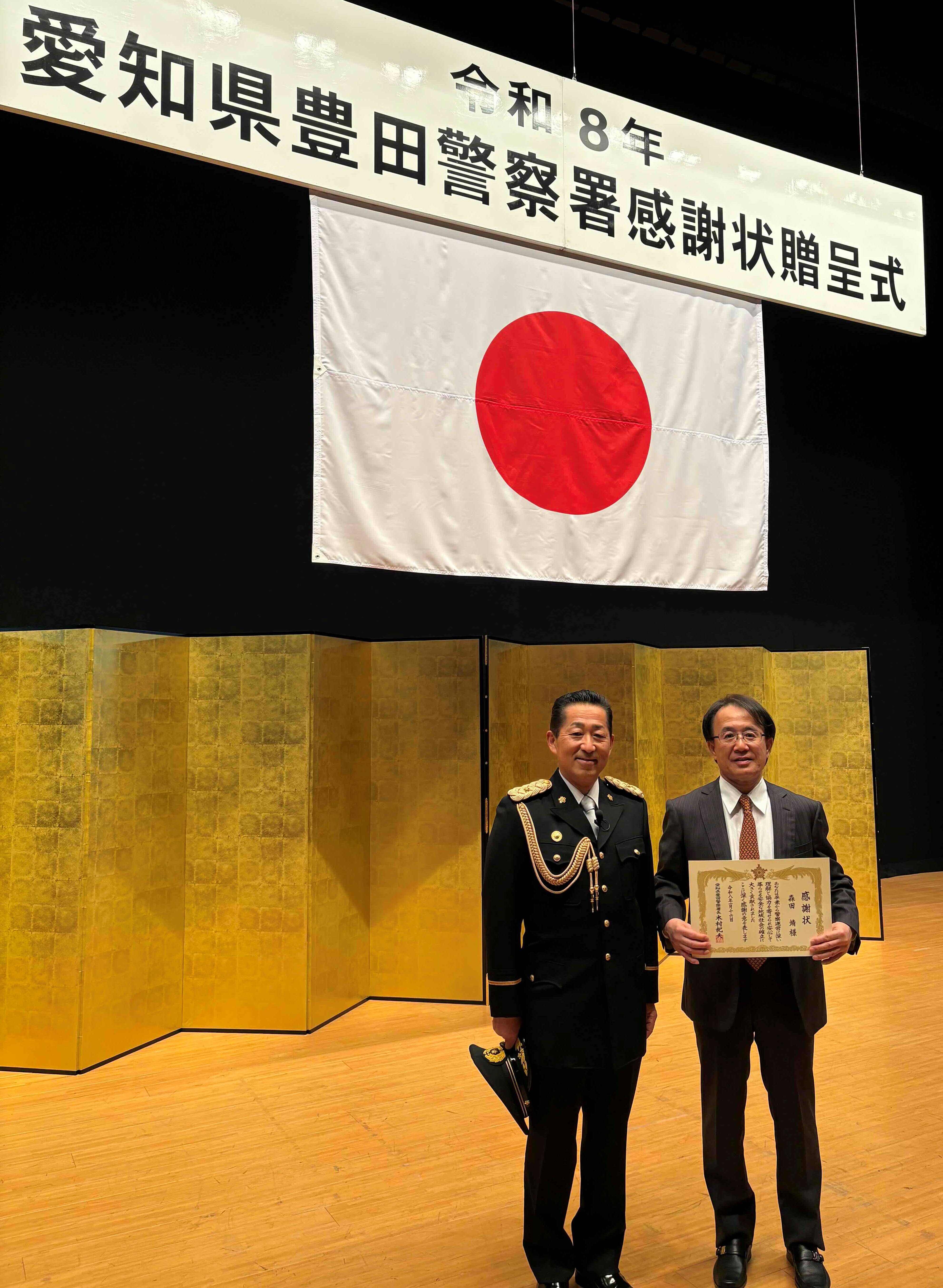 森田靖教授が愛知県豊田警察署の木村紀夫署長から感謝状を授与されました  大学や産業界における発電、蓄電、EV自動車および量子技術等に関わる最新の科学技術についての情報交換を、令和元年から豊田警察署所属の愛知県警察署員と定期的に行なってきたことが高い評価を得ました。 贈呈式は、令和8年1月16日に豊田市福祉センター大ホールで行われました。