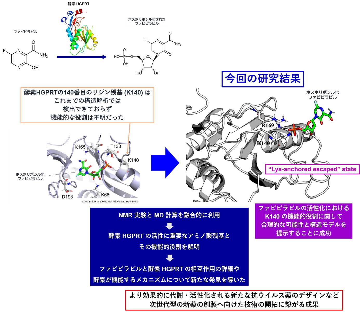 本研究では、富士フイルム富山化学株式会社が開発した抗ウイルス薬ファビピラビルが、ヒト体内に存在する酵素であるヒポキサンチン-グアニンホスホリボシルトランスフェラーゼ(HGPRT)によって代謝され、抗ウイルス効果を発揮する活性型へと変換される過程を、核磁気共鳴(NMR)分光法を用いてリアルタイムに観測する手法を確立しました。さらに、計算科学的手法を組み合わせた解析により、HGPRTがファビピラビルを活性化する分子機序の一端を明らかにしています。