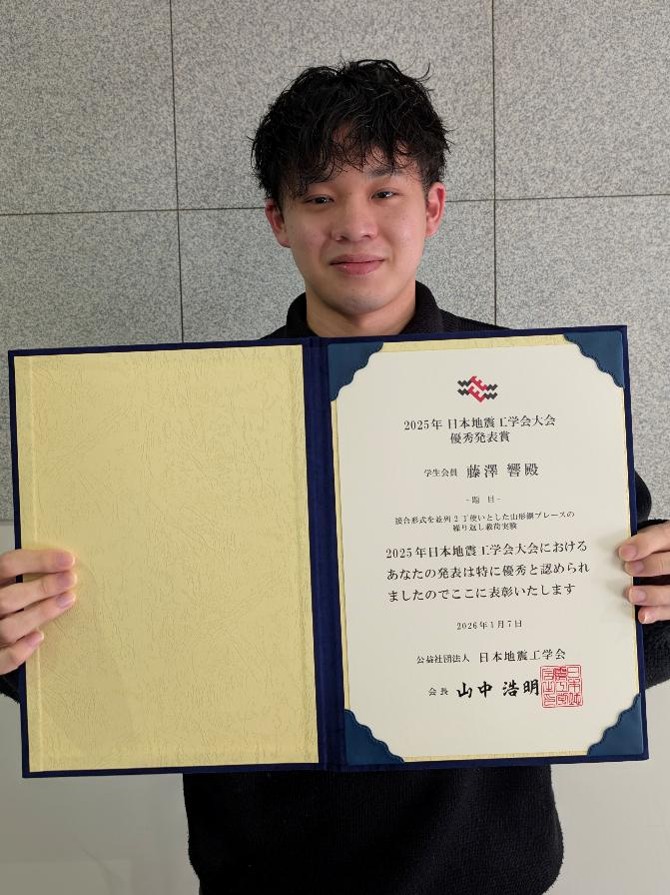 鋼構造建築物の耐震部材として用いられることが多い山形鋼ブレースに対し,地震の揺れを模した繰り返し変形を与える実験を行います.本研究では,実験結果に基づいて,地震後の建物の被害度合いを推定する方法を構築します.本研究の成果は日本地震工学会大会(2025年12月@沖縄)で担当学生の藤澤 響くんが発表し,優秀発表賞を受賞しました.有名国立大学の発表者が並ぶ中で当研究室の4年生がこのような賞を受賞できたことを,大変誇らしく思います.